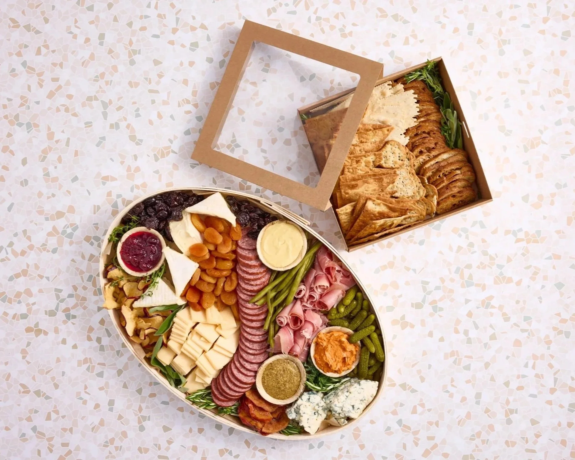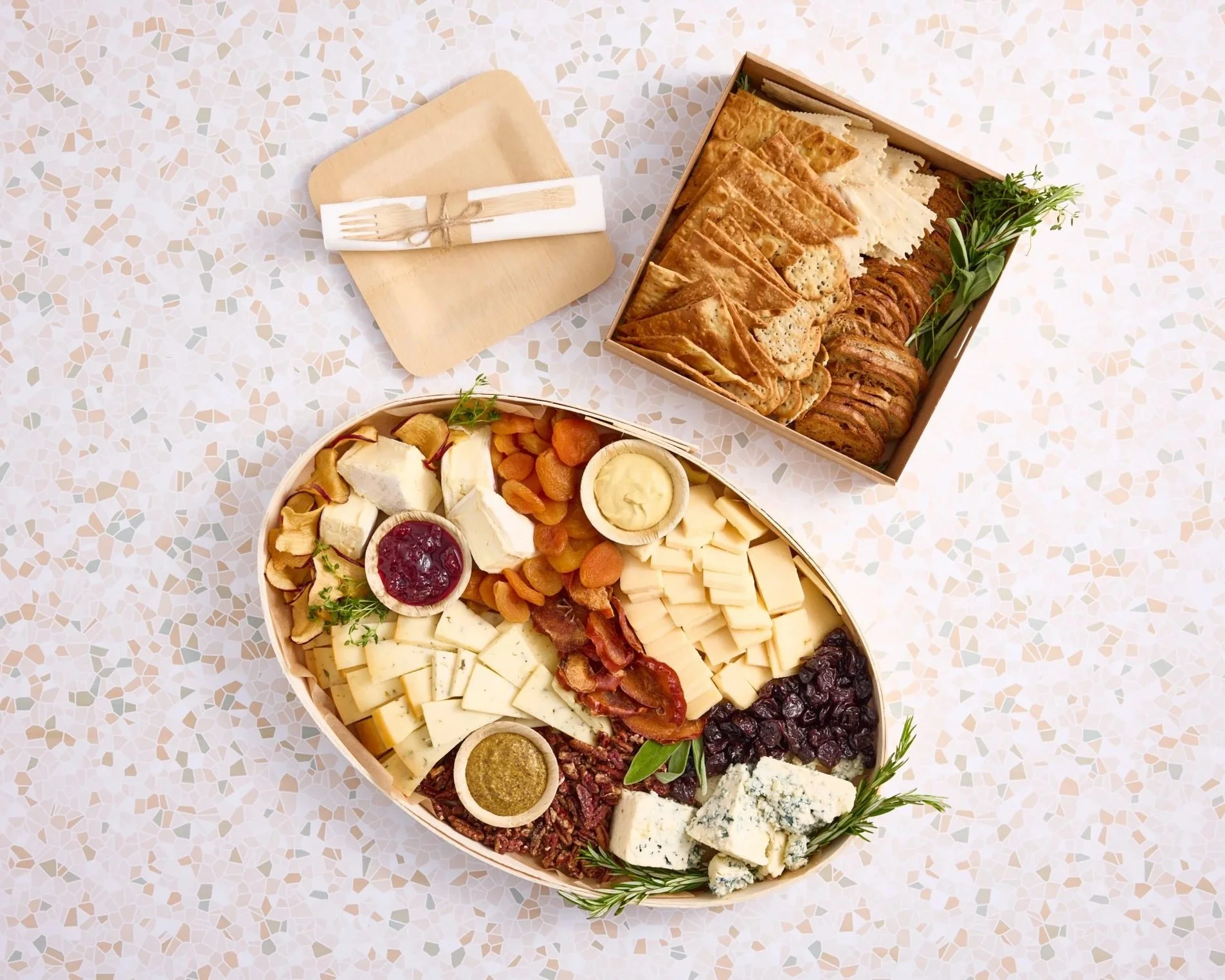 All orders are served on compostable wooden boards or white recyclable platters, with compostable wooden serving utensils. Appetizer plates, napkins and utensils for guests are not included.