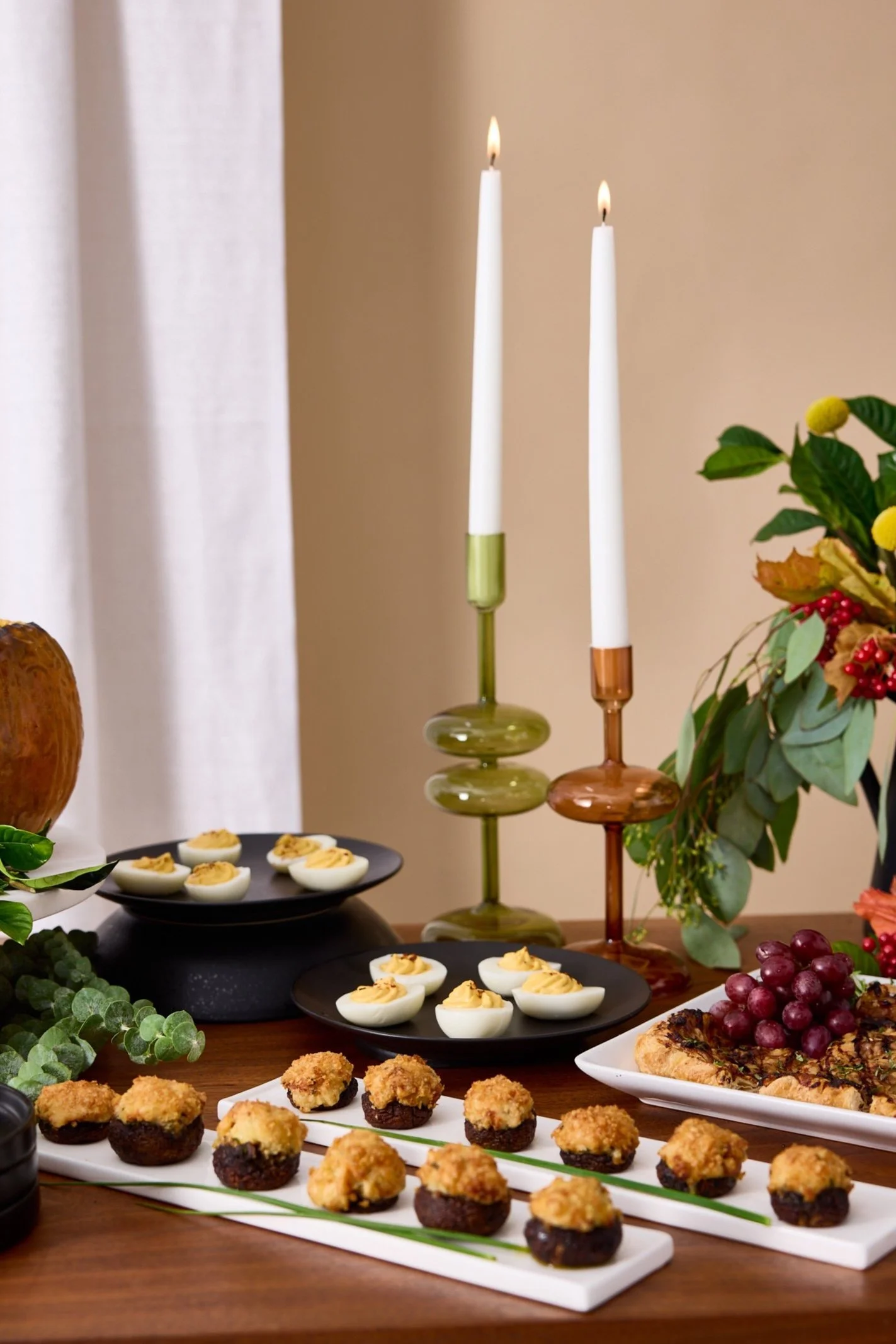Classic deviled eggs get a fall glow up with roasted pumpkin and harissa. Sold by the dozen. Gluten free, dairy free, and vegetarian.
