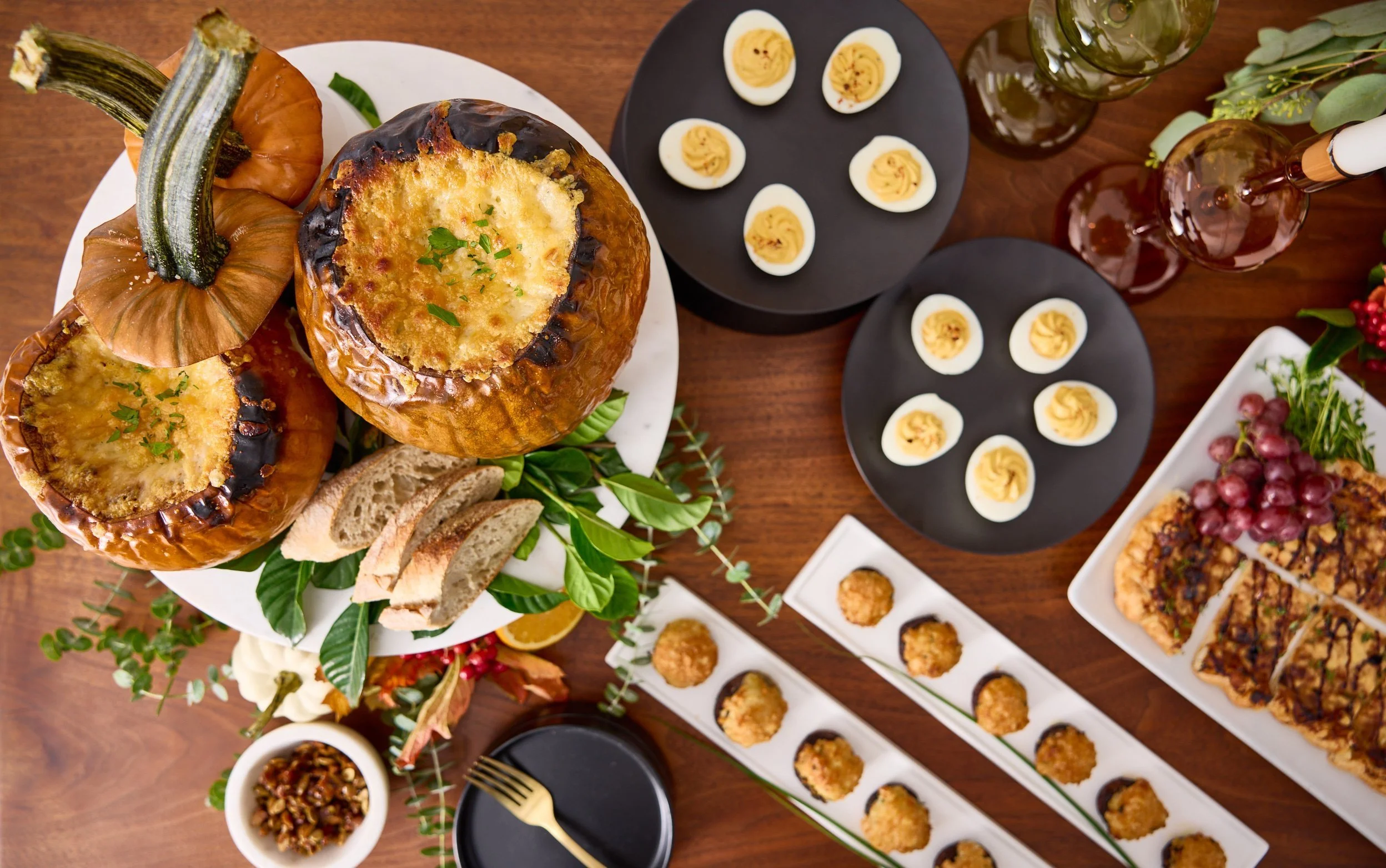 A show stopping appetizer or Thanksgiving table centerpiece, these roasted cheesy sugar pumpkins are filled with smoked gruyere, white wine, cream, and thyme then roasted until tender and melty, and served with crostini for dipping. Priced per pumpkin. Vegetarian.